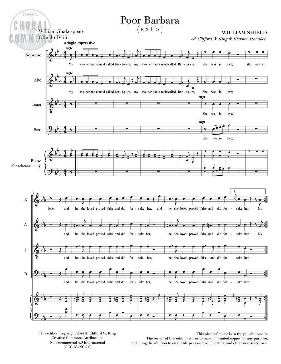 POOR BARBARA - William Shield - SATB